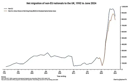 I present to you two graphs of migration into the US and the UK. Here’s over 30 years of immigration into the UK: